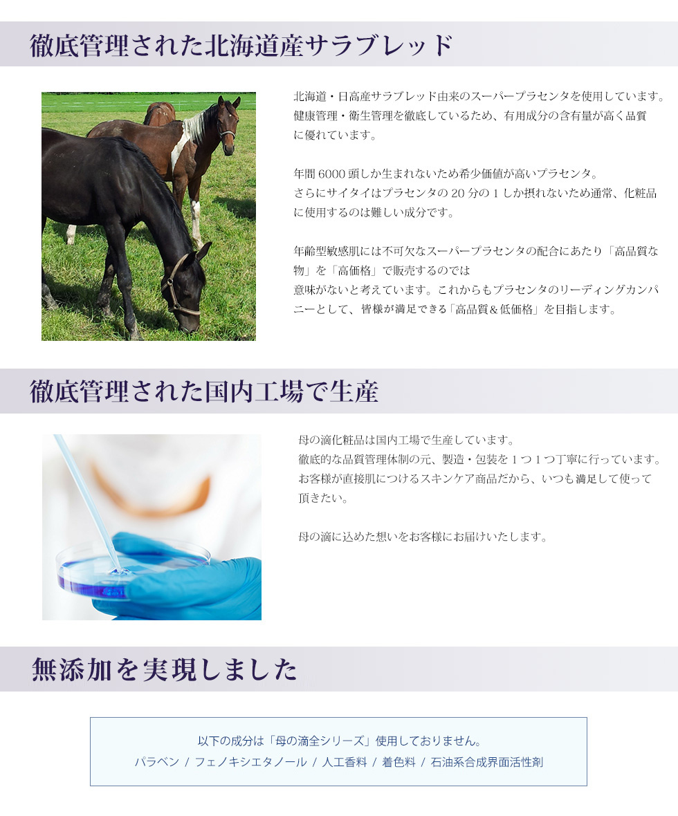 | 内容量 | 母の滴化粧水:122ml / 母の滴美容液: 32ml / 母の滴クリーム: 32g |